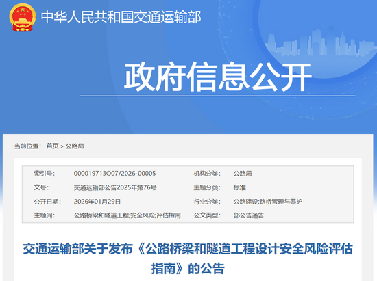 現發(fā)布《公路橋梁和隧道工程設計安全風險評估指南》(JTG/T 3302-2025),作為公路工程推薦性行業(yè)標準,自2026年4月1日起施行。原發(fā)布的《關于在初步設計階段實行公路橋梁和隧道工程安全風險評估制度的通知》(交公路發(fā)〔2010〕175號)同時廢止。