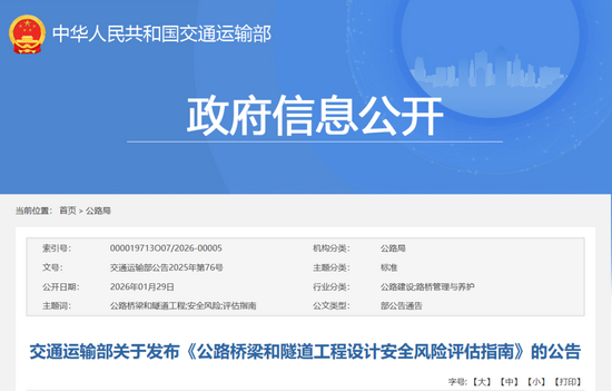 《公路橋梁和隧道工程設(shè)計(jì)安全風(fēng)險(xiǎn)評(píng)估指南》(JTG/T 3302—2025),作為公路工程推薦性行業(yè)標(biāo)準(zhǔn),自2026年4月1日起施行。原發(fā)布的《關(guān)于在初步設(shè)計(jì)階段實(shí)行公路橋梁和隧道工程安全風(fēng)險(xiǎn)評(píng)估制度的通知》(交公路發(fā)〔2010〕175號(hào))同時(shí)廢止。