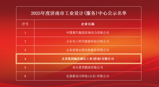 近日,濟(jì)南市工業(yè)和信息化局公布名單,太重榆液濟(jì)南公司成功入選“濟(jì)南市工業(yè)設(shè)計(服務(wù))中心”。這是太重榆液在科技創(chuàng)新與設(shè)計賦能道路上取得的又一成果,標(biāo)志著公司在液壓裝備細(xì)分領(lǐng)域的研發(fā)設(shè)計能力獲得政府與行業(yè)認(rèn)可。