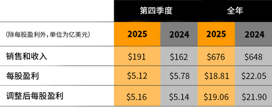 2025年第四季度銷售和收入為191億美元,較2024年第四季度的162億美元增長18%。2025年第四季度營業(yè)利潤率為13.9%,而2024年第四季度為18.0%。2025年第四季度調(diào)整后營業(yè)利潤率為15.6%,而2024年第四季度為18.3%。2025年第四季度每股盈利為5.12美元,而2024年第四季度每股盈利為5.78美元。2025年第四季度調(diào)整后每股盈利為5.16美元,而2024年第四季度調(diào)整后每股盈利為5.14美元。