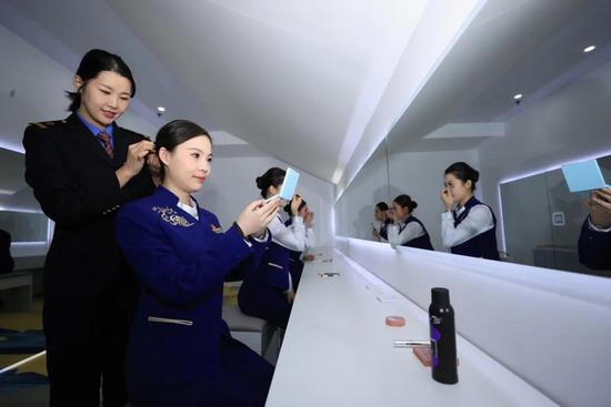 除了高效的智能系統(tǒng),智享服務(wù)中心還有暖心周到的服務(wù)設(shè)施。600個智能儲物柜實現(xiàn)“一人一柜”,讓乘務(wù)員的私人物品有了專屬“小窩”;更衣區(qū)內(nèi),梳妝鏡、置物臺、形體鏡等設(shè)施一應(yīng)俱全,為乘務(wù)員打造了整潔、便利的儀容整理空間。