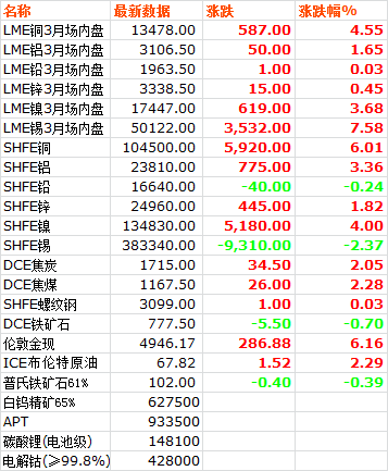 日,LME六種基本金屬價(jià)格全線(xiàn)上漲。三月期銅價(jià)收于13478美元噸,上漲4.55%。三月期鋁價(jià)收于3106.5美元噸,上漲1.65%。三月期鉛價(jià)收于1963.5美元噸,上漲0.03%。三月期鋅價(jià)收于3338.5美元噸,上漲0.45%。三月期錫價(jià)收于50122美元噸,上漲7.58%。三月期鎳價(jià)收于17447美元噸,上漲3.68%