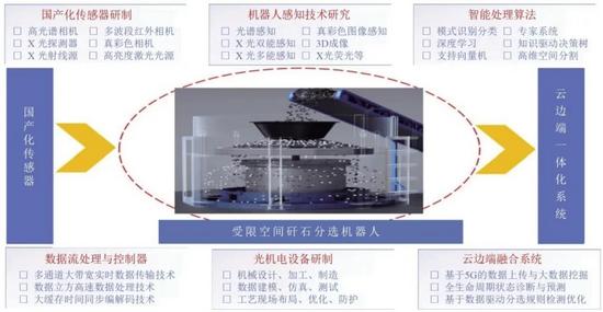 智能干選機(TDS)在地面開闊場景驗證了高效性,但需針對受限空間進行智能化升級?;诖耍邪l(fā)受限空間TDS智能選矸機器人,解決設(shè)備進得去、分得出的基礎(chǔ)問題,通過感知、裝備、控制的全鏈條智能化設(shè)計,成為智能化礦井建設(shè)中“小空間大智能”的典型實踐,為受限場景智能化改造提供新思路,受限空間立式X光智能選矸機器人研究思路如圖1所示。