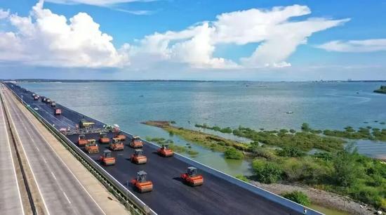 鐵山港跨海特大橋橋面施工現(xiàn)場,艷陽高照、晴光鋪岸、風(fēng)拂潮平。