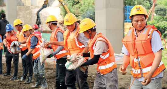 項目組織開展防汛聯(lián)合應(yīng)急演練,搶險人員搬運沙袋加固臨時攔水渠。
