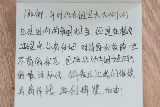 天津動(dòng)車客車段天津動(dòng)車運(yùn)用所一級(jí)丙組工長(zhǎng)孫桐把自己親手寫(xiě)的紙條,遞給班組機(jī)械師孫慨卿,讓平常外向開(kāi)朗的孫慨卿紅了眼眶。