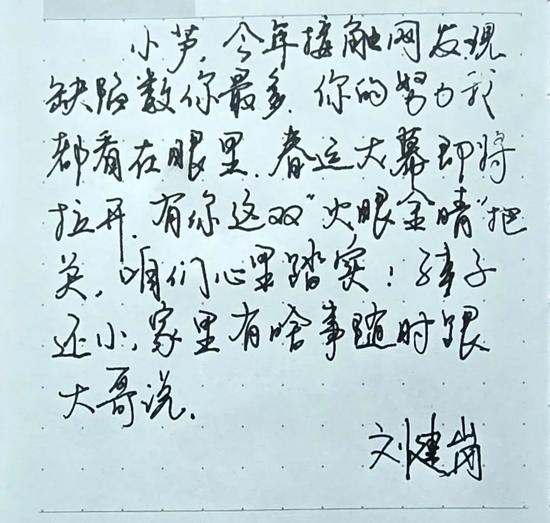 看到主任給我的紙條,我心里又暖又有勁。隱患排查是咱的本分,再辛苦都值!春運(yùn)到來(lái),我會(huì)繼續(xù)擦亮“火眼金睛”,盯緊每一寸接觸網(wǎng),和大伙兒并肩作戰(zhàn),守住供電安全防線,讓列車安安穩(wěn)穩(wěn)飛馳!