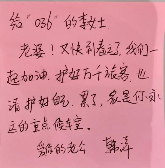 韓洋和李如玉是一對(duì)“90后”夫妻,兩人結(jié)婚8年,在北京西站并肩工作了13年。工作間隙,韓洋在便利貼上寫(xiě)下了一段話,托人捎給正在“036”候車室值守的李如玉。今年春運(yùn),兩人仍然在不同的崗位上守護(hù)萬(wàn)千旅客的歸途。