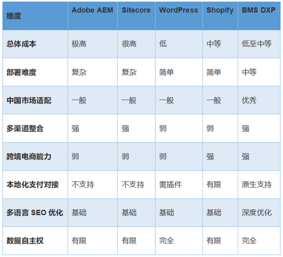 在全球數(shù)字體驗平臺市場中,已有多款成熟的國際產(chǎn)品,如Adobe Experience Manager(AEM)、Sitecore、WordPress、Shopify等。這些平臺各具特色,但在服務中國出海企業(yè)時,都存在不同程度的"水土不服"。