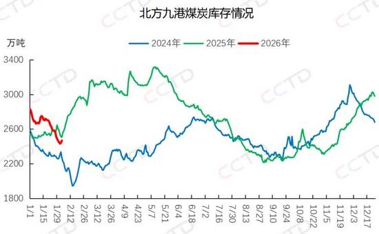 近期,受部分港口出現(xiàn)短時(shí)封航影響,北港庫(kù)存略有增加,但低于去年同期水平。截至目前,北方九港庫(kù)存已增至2400萬(wàn)噸左右,較去年同期減少約40萬(wàn)噸。后期來(lái)看,由于臨近春節(jié),多數(shù)貿(mào)易商將進(jìn)入休假模式,北港煤炭調(diào)入量或呈現(xiàn)下降態(tài)勢(shì)。隨著封航結(jié)束,北港調(diào)出量會(huì)有所恢復(fù),但春節(jié)前終端以兌現(xiàn)長(zhǎng)協(xié)為主,市場(chǎng)煤需求或偏弱,北港煤炭調(diào)出量或下降。綜上,預(yù)計(jì)春節(jié)前,北港庫(kù)存或維持低位水平。