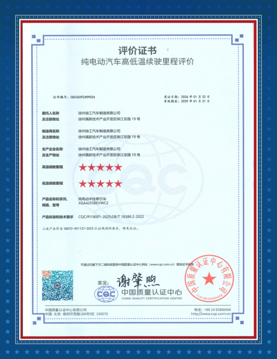 近日,中國(guó)質(zhì)量認(rèn)證中心(CQC)發(fā)布了新能源汽車?yán)m(xù)駛里程評(píng)價(jià)結(jié)果。徐工新能源牽引車憑借高低溫環(huán)境下卓越的續(xù)航表現(xiàn),榮獲行業(yè)唯一“純電動(dòng)汽車高低溫續(xù)駛里程雙五星評(píng)價(jià)”標(biāo)志著徐工新能源重卡在極端溫度工況下的續(xù)航可靠性達(dá)到行業(yè)領(lǐng)先水平。