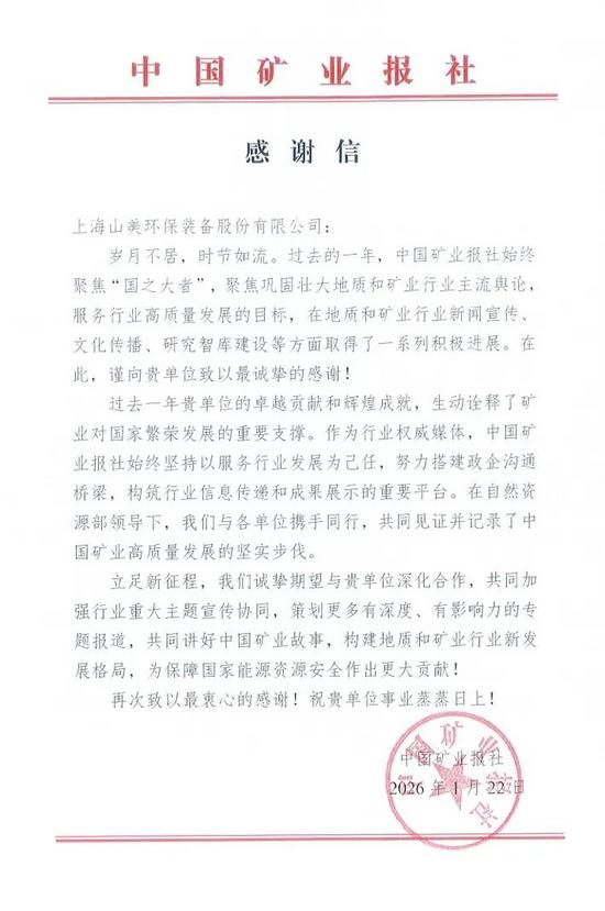 歲月輪回又一載,新春祝福迎面來(lái)!近日,上海山美環(huán)保裝備股份有限公司收到了中國(guó)礦業(yè)報(bào)社的年終感謝信,這封感謝信不僅是對(duì)公司過(guò)去一年礦業(yè)領(lǐng)域技術(shù)創(chuàng)新的肯定和鼓勵(lì),更是雙方深厚合作情誼的見(jiàn)證。信中,中國(guó)礦業(yè)報(bào)社對(duì)上海山美環(huán)保裝備股份有限公司在過(guò)去一年中的卓越貢獻(xiàn)表示誠(chéng)摯的感謝,并表達(dá)了深化合作、共同加強(qiáng)行業(yè)重大主題宣傳協(xié)同的期望。