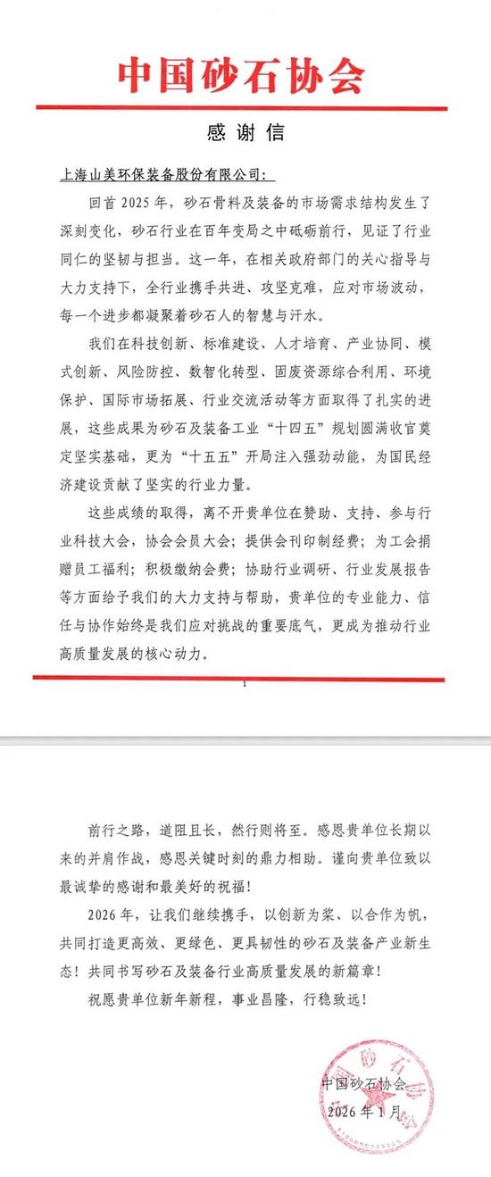 在這個(gè)充滿挑戰(zhàn)與機(jī)遇并存的時(shí)代,每一個(gè)攜手同行的瞬間都顯得尤為珍貴。近日,上海山美股份收到來自中國砂石協(xié)會(huì)的感謝信。信中提到了過去一年上海山美股份在協(xié)會(huì)各項(xiàng)事務(wù)中鼎力支持和重視,并對(duì)上海山美股份多年以來為行業(yè)和協(xié)會(huì)發(fā)展作出的重要貢獻(xiàn)表示感謝。