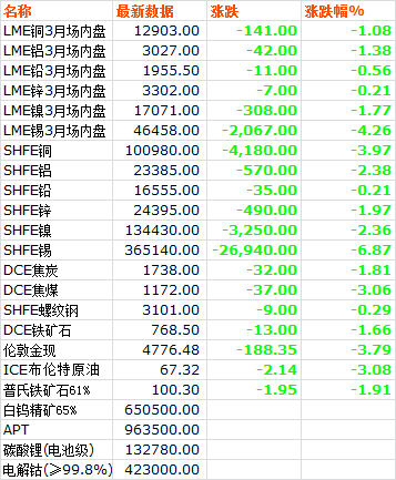 日,LME六種基本金屬價格全線下跌。三月期銅價收于12903美元噸,下跌1.08%。三月期鋁價收于3027美元噸,下跌1.38%。三月期鉛價收于1955.5美元噸,下跌0.56%。三月期鋅價收于3302美元噸,下跌0.21%。三月期錫價收于46458美元噸,下跌4.26%。三月期鎳價收于17071美元噸,下跌1.77%