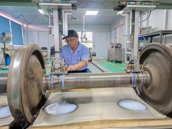 “探傷設(shè)備校準(zhǔn)完畢,耦合劑均勻涂抹,開始探傷作業(yè)。”在中鐵特貨物流股份有限公司廣州機(jī)保段檢修車間,探傷組工長(zhǎng)宋平專注地操控超聲波探頭在車輛配件上方緩慢移動(dòng)。屏幕上的波形曲線在他眼中如同“安全密碼”,每一個(gè)波動(dòng)都牽動(dòng)著鐵路運(yùn)輸?shù)钠桨驳拙€。
