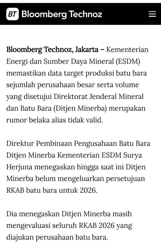 據(jù)彭博社消息,印尼能源與礦產(chǎn)資源部就市場上流傳的各類猜測發(fā)布明確澄清聲明。礦產(chǎn)與煤炭司司長特里·維納爾諾表示,2026年煤炭開采工作計劃(生產(chǎn)經(jīng)營預(yù)算計劃)的核準(zhǔn)文件尚未正式發(fā)布,因此近期社交媒體上廣泛傳播的、涉及印多坦邦拉亞美加、黃金能源礦業(yè)、聯(lián)合拖拉機(jī)等多家主要上市公司產(chǎn)量大幅削減的相關(guān)數(shù)據(jù)表,已被官方認(rèn)定為無效信息,即虛假信息。
