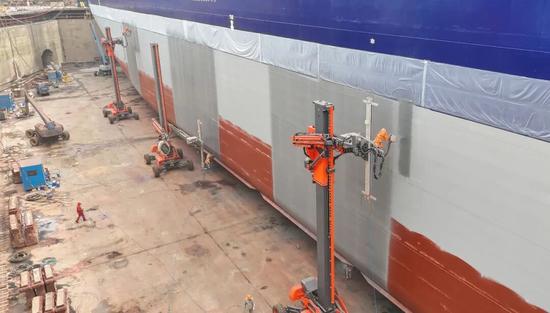傳統(tǒng)的船體除銹、噴涂作業(yè),長(zhǎng)期依賴人工,效率低、成本高、品質(zhì)差,還面臨嚴(yán)重的安全與環(huán)保問(wèn)題。鼎力創(chuàng)新性地將高空作業(yè)平臺(tái)與機(jī)器人技術(shù)深度融合,打造了一套集成化的智能作業(yè)系統(tǒng),真正實(shí)現(xiàn)均勻、高效的除銹與噴涂作業(yè),徹底解決了行業(yè)痛點(diǎn),為全球船舶修造業(yè)樹立了智能化轉(zhuǎn)型的標(biāo)桿。