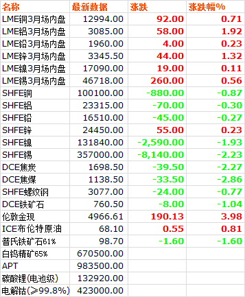 日,LME六種基本金屬價(jià)格全線上漲。三月期銅價(jià)收于12994美元噸,上漲0.71%。三月期鋁價(jià)收于3085美元噸,上漲1.92%。三月期鉛價(jià)收于1960美元噸,上漲0.23%。三月期鋅價(jià)收于3345.5美元噸,上漲1.32%。三月期錫價(jià)收于46718美元噸,上漲0.56%。三月期鎳價(jià)收于17090美元噸,上漲0.11%