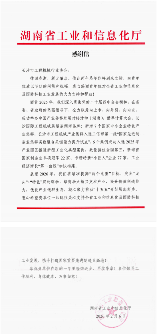 近日,協(xié)會收到了湖南省工信廳發(fā)來的感謝信,對協(xié)會助力全省工業(yè)和信息化及國防科技工業(yè)發(fā)展的努力給予充分肯定。新的一年,協(xié)會將繼續(xù)發(fā)揮橋梁紐帶作用,凝心聚力、務(wù)實篤行,持續(xù)提升服務(wù)效能,與全體會員企業(yè)攜手并肩,共同譜寫長沙工程機械產(chǎn)業(yè)高質(zhì)量發(fā)展的嶄新篇章!