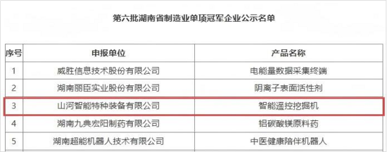 湖南省制造業(yè)單項(xiàng)冠軍評(píng)選標(biāo)準(zhǔn)嚴(yán)格,要求企業(yè)長(zhǎng)期專注于特定細(xì)分領(lǐng)域,主導(dǎo)產(chǎn)品市場(chǎng)占有率須達(dá)到全球或全國(guó)前列,并具備先進(jìn)的生產(chǎn)技術(shù)和工藝水平,代表省內(nèi)相關(guān)領(lǐng)域的頂尖實(shí)力。此次獲評(píng),是對(duì)山河智能深耕無(wú)人化、智能化賽道,堅(jiān)持“先導(dǎo)式創(chuàng)新”發(fā)展路徑的有力認(rèn)可。