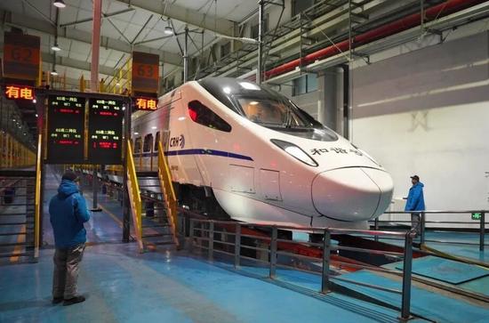 檢修庫內(nèi),廣播聲接連不斷。當大門緩緩打開,列車風(fēng)笛聲響起,室外冷氣直直撲向防護帶兩側(cè)的接車職工,瞬時驅(qū)散了周身的熱氣?!按哼\期間,列車入庫時間比平時更晚,后半夜也就更忙。”哈爾濱西動車組運用所地勤檢一組副工長劉柏辰介紹道。