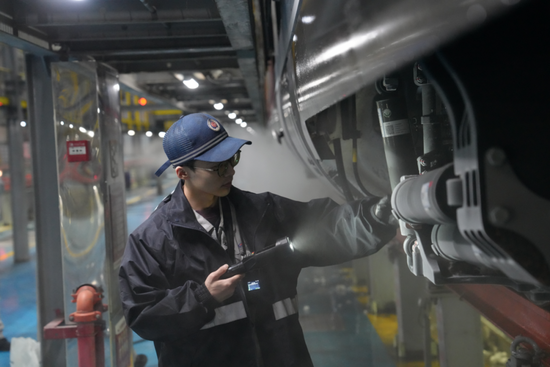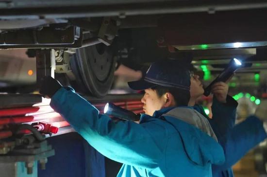 2月7日7時許,隨著最后一組入庫列車檢修完畢,王榛基從車底走了出來,他直起身,用力伸展了一下僵硬的腰肢,下意識地搓了搓凍得通紅的雙手。