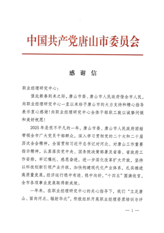 近日,職業(yè)經(jīng)理研究中心收到中共唐山市委、唐山市人民政府發(fā)來的感謝信,信中對中心在推進(jìn)職業(yè)經(jīng)理人才培養(yǎng)、助力唐山高質(zhì)量發(fā)展中給予的支持與協(xié)助表達(dá)了誠摯謝意。作為與職業(yè)經(jīng)理研究中心深度關(guān)聯(lián)的企業(yè),唐山亞特專用汽車有限公司(簡稱“亞特重工”)對此倍感振奮,并向職業(yè)經(jīng)理研究中心致以最熱烈的祝賀!