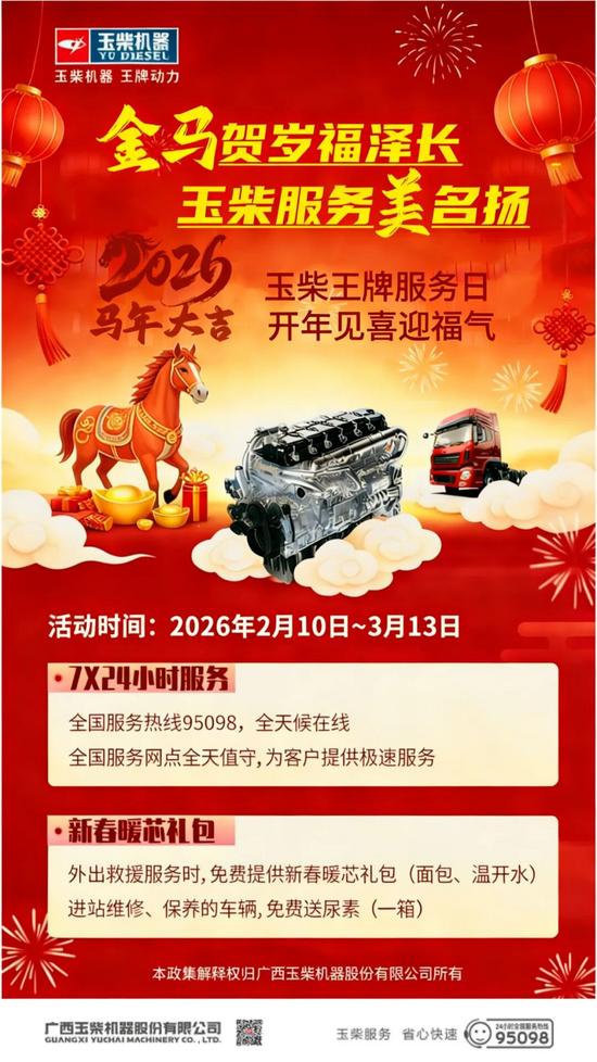 新春將至,萬物萌動,正是啟程出發(fā)、奔赴新程的最好時節(jié)。當(dāng)您駕車駛過初綻新綠的田野、穿行于暖陽灑落的城市街巷,車輪滾滾向前,承載的是對事業(yè)的篤定、對生活的熱望,更是玉柴機器在春運期間沉穩(wěn)有力的每一次呼吸與回應(yīng)。這個早春,玉柴“金馬賀歲福澤長 玉柴服務(wù)美名揚”王牌服務(wù)日溫暖上線,為您提供澎湃動力。