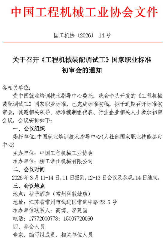 受中國就業(yè)培訓技術指導中心委托,我會牽頭開發(fā)的《工程機械裝配調試工》國家職業(yè)標準,已完成標準初稿,擬于近期召開標準初審會,誠邀相關領導、標準編制組代表、行業(yè)企業(yè)相關人士參加會議,會議安排如下: