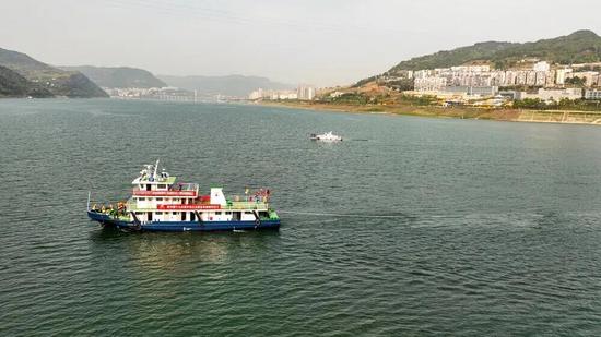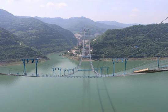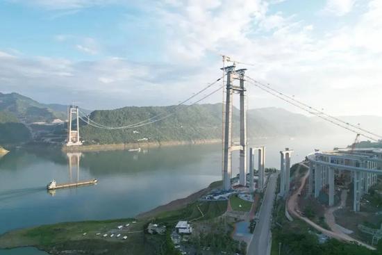 2023年4月10日上午9時(shí),在海事部門(mén)的全程護(hù)航下,由北主塔岸邊出發(fā)的船舶拽拉著先導(dǎo)索,經(jīng)過(guò)1個(gè)小時(shí)的牽引,長(zhǎng)達(dá)2000米的先導(dǎo)索成功橫跨1100多米的江面,與南主塔下方的鋼絲過(guò)渡索成功連接,并在南北岸塔頂卷?yè)P(yáng)機(jī)的配合下,提升至江面40米的高空。至此,先導(dǎo)索過(guò)江作業(yè)完成,雙塔成功實(shí)現(xiàn)跨江“牽手”。
