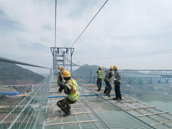 工人正在進(jìn)行復(fù)興長(zhǎng)江大橋貓道施工