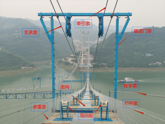 在復(fù)興長(zhǎng)江大橋的建設(shè)過(guò)程中,貓道作為主纜架設(shè)、梁體吊裝等關(guān)鍵工序的作業(yè)平臺(tái)和安全通道,其結(jié)構(gòu)設(shè)計(jì)與實(shí)際受力狀態(tài)至關(guān)重要。該橋的貓道采用三跨連續(xù)式結(jié)構(gòu),其邊跨平面線形呈外八字形,與主橋軸線夾角為1.009°,大大增加了貓道的設(shè)計(jì)及施工難度。