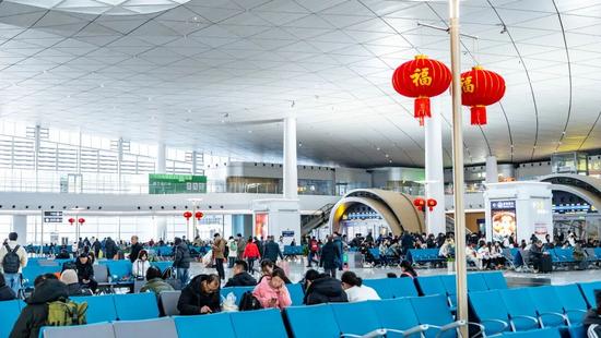 正值春運(yùn),杭州西站候車大廳人流如織,井然有序。巨幅電子屏上滾動著車次信息,紅燈籠與“?!弊盅b點(diǎn)其間,透著濃濃的暖意和年味。