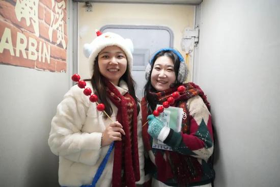 車窗玻璃上凝結(jié)的薄薄冰霜成了旅客們的天然“畫板”。來自廣州的余女士和同伴在車廂連接處,熱情展示著她們畫的精美圖案?!拔覀兿肴ツ涌囱?,追極光!”余女士笑著說,“這趟車第二天早上就能到,時(shí)間安排得很好,我們放下行李就能出去玩?!?/span>