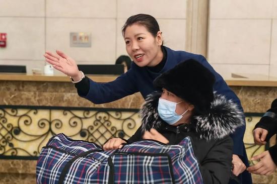 16時(shí)28分,列車開始檢票,檢票口閘機(jī)“滴滴”聲此起彼伏。站臺(tái)上,哈爾濱客運(yùn)段漠河車隊(duì)列車長(zhǎng)趙喜茹引導(dǎo)旅客有序乘降,列車員們幫助旅客搬運(yùn)行李。由于客流激增,這趟列車臨時(shí)加掛了4節(jié)硬臥車廂,車廂里滿是穿著棉襖、拎著年貨的旅客,大家臉上洋溢著喜悅。