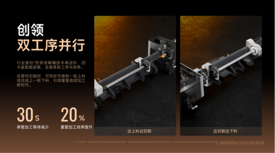 將單管加工等待時間減少30秒以上,重管加工效率提升超過20%,徹底打破了“上料-切割-等待-下料”的單序傳統(tǒng)循環(huán),引領(lǐng)重管加工進(jìn)入不間斷的“工序成雙 效率無雙”全新時代。