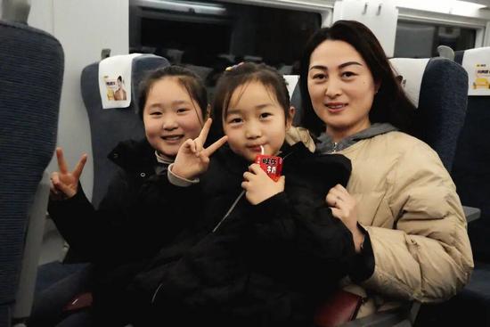另外一節(jié)車廂里,旅客慕女士正和兩個女兒有說有笑。她在重慶工作,回延安老家過年。“放寒假了,孩子們一直盼著回延安跟姥姥姥爺一起剪窗花、蒸花饃呢!