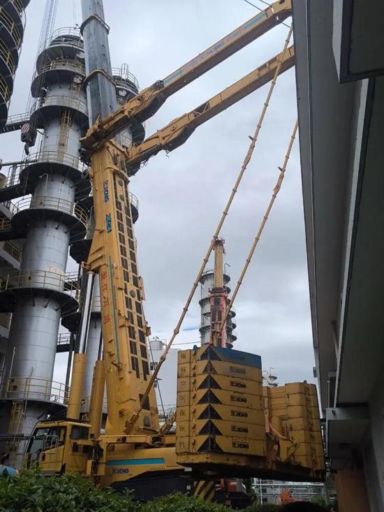 杭州某化工廠需在僅4米寬的通道內(nèi),為長40.5米、重140噸的氧化塔“搬家”。徐工部署了XCA300、XCA350、XCA600L8、XCA750組成的“特種小隊”。