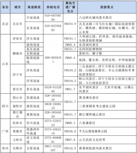 公眾出行前可電話咨詢鐵建高速全國統(tǒng)一服務(wù)熱線400-005-9191,留意屬地交通廣播頻道路況信息播報: