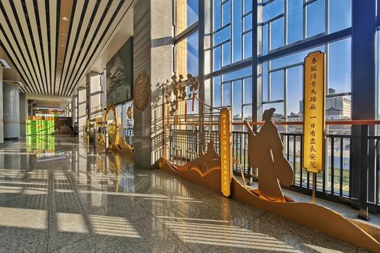 移步候車區(qū)中部,全國首個(gè)唐代里坊文化主題候車區(qū)“盛唐十二坊”驚艷亮相。車站以主通道為中軸,兩側(cè)復(fù)原了長樂、永樂、崇德、崇業(yè)等十二坊巷景致,勾勒出“一軸十二坊,一步一盛唐”的沉浸式場景——