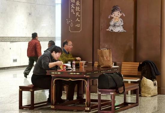 視線轉(zhuǎn)向開水間旁,依據(jù)敦煌壁畫元素設(shè)計(jì)的四方桌椅整齊擺放,方便旅客休憩用餐,“桌子寬敞又好看,吃飯都格外舒心!”務(wù)工返鄉(xiāng)的常先生與妻子圍桌而坐,邊用餐邊不住稱贊,眉眼間滿是愜意。