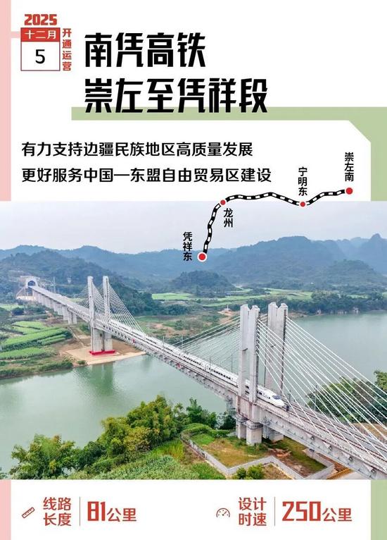 2025年12月5日,隨著南憑高鐵崇憑段開通運(yùn)營,南憑高鐵全線貫通,憑祥、寧明、龍州等地邁入高鐵時(shí)代。南寧至憑祥的時(shí)空距離大幅壓縮,極大改善沿線交通條件,便利相關(guān)區(qū)域人民群眾出行。