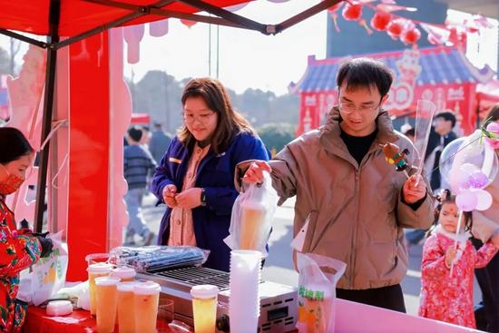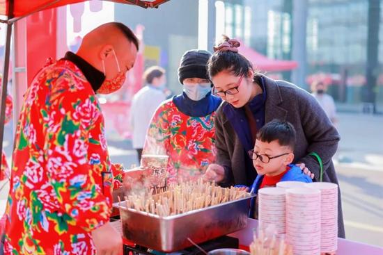 春聯(lián)攤前,“?!弊謩偮渥詈笠还P,便被笑吟吟接走;糖畫攤邊,銅勺為筆、糖漿為墨,映著孩子們癡癡的眼神……整條市集浸在暖融融的喧騰里,年味就這樣,在一遞一接、一看一笑里,圓圓滿滿。