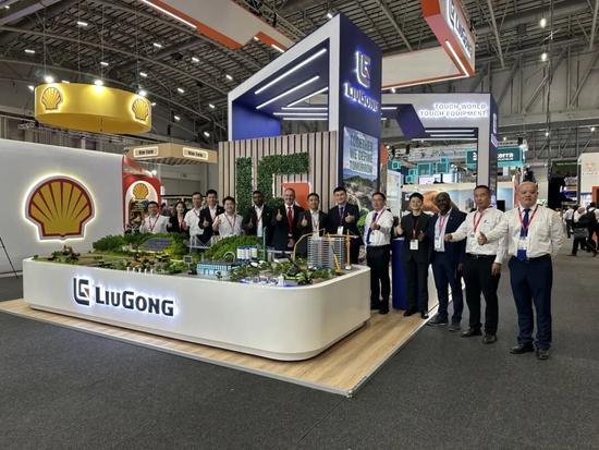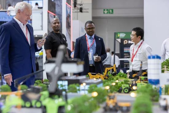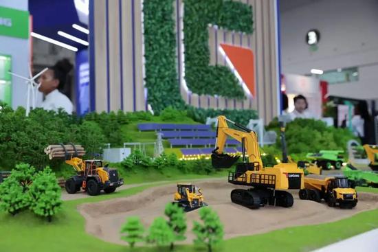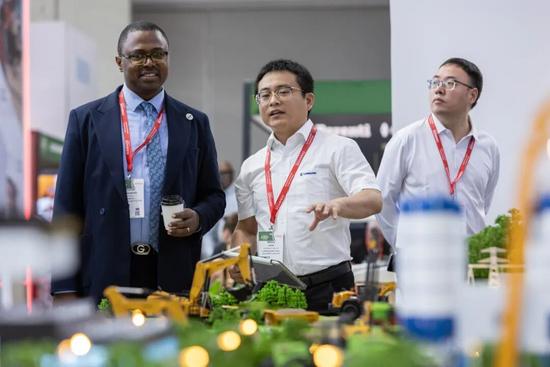 柳工現(xiàn)場(chǎng)通過(guò)動(dòng)態(tài)沙盤(pán)打造了微縮“柳工世界”,集中展示了覆蓋非洲多領(lǐng)域發(fā)展的智能化裝備體系:包括針對(duì)西非林業(yè)木材轉(zhuǎn)運(yùn)的抱叉版856T裝載機(jī)與LD20D防護(hù)型推土機(jī);RD45-CS鉆機(jī)破碎、大型設(shè)備鏟裝及剛性車運(yùn)輸至電動(dòng)移動(dòng)破碎站的硬巖開(kāi)采全流程作業(yè);以及集成光、風(fēng)電的微電網(wǎng)綠色能源方案。