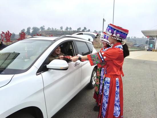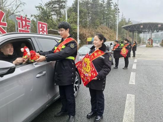 公路運(yùn)營公司安慈項(xiàng)目經(jīng)理部組織工作人員身著民族服裝,在沿線收費(fèi)站、服務(wù)區(qū)設(shè)立服務(wù)點(diǎn)位,為司乘人員親手送上福字。紅彤彤的福字映襯著工作人員的熱情,讓奔波的旅途收獲別樣新春驚喜,以暖心服務(wù)踐行對司乘的關(guān)懷。