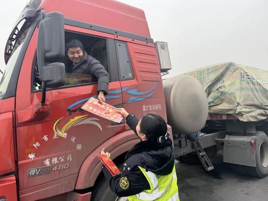 公路運(yùn)營公司京新項(xiàng)目經(jīng)理部組織志愿者為往返司乘送上手寫“?!弊峙c新春祝福。志愿者們將滿載年味的福字遞至司機(jī)手中,并道一聲“一路平安”,讓奔波在風(fēng)雪歸途的旅客感受到濃濃暖意,彰顯鐵建高速的溫度。