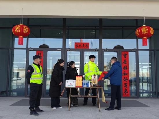 公路運(yùn)營公司濟(jì)寧項(xiàng)目管理部開展“情暖返鄉(xiāng)路 新春送祝福”特色活動,在各收費(fèi)站、服務(wù)區(qū)布置春運(yùn)服務(wù)點(diǎn)。工作人員化身“新春護(hù)航員”,為司乘送上手寫福字、定制春聯(lián)和問候,并備有熱飲、應(yīng)急藥品、車輛應(yīng)急工具,提供路線指引等服務(wù),以暖心舉措傳遞鐵建高速的溫情與擔(dān)當(dāng)。