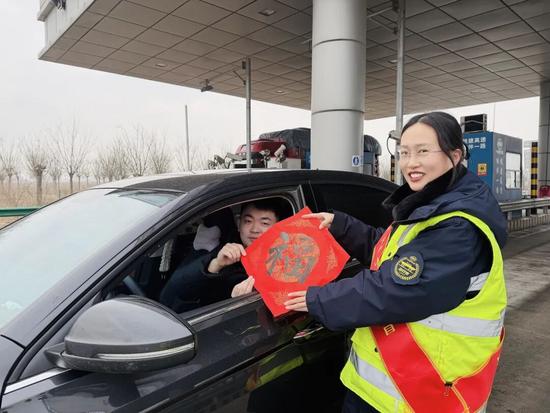 公路運(yùn)營公司濟(jì)樂項(xiàng)目經(jīng)理部在濟(jì)樂高速沿線各收費(fèi)站、服務(wù)區(qū),向司乘送上親手書寫的“?!弊峙c春聯(lián)。手握福字的司乘,收獲的不僅是祝福,更是高速人對“平安守護(hù)”的鄭重承諾,守護(hù)每一程,溫暖每一刻。