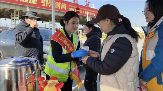 公路運(yùn)營公司興延項(xiàng)目經(jīng)理部工作人員為過往司乘送上熱姜茶、大棗紅糖、姜絲可樂、熱橙汁等熱飲,搭配應(yīng)急藥品、簡易擦車工具等便民服務(wù)。針對春運(yùn)車流密集特點(diǎn),站點(diǎn)提前備好福字貼畫、馬年吉祥物等新春禮品,為奔波司乘送上祝福,用實(shí)際行動為春運(yùn)出行保駕護(hù)航。